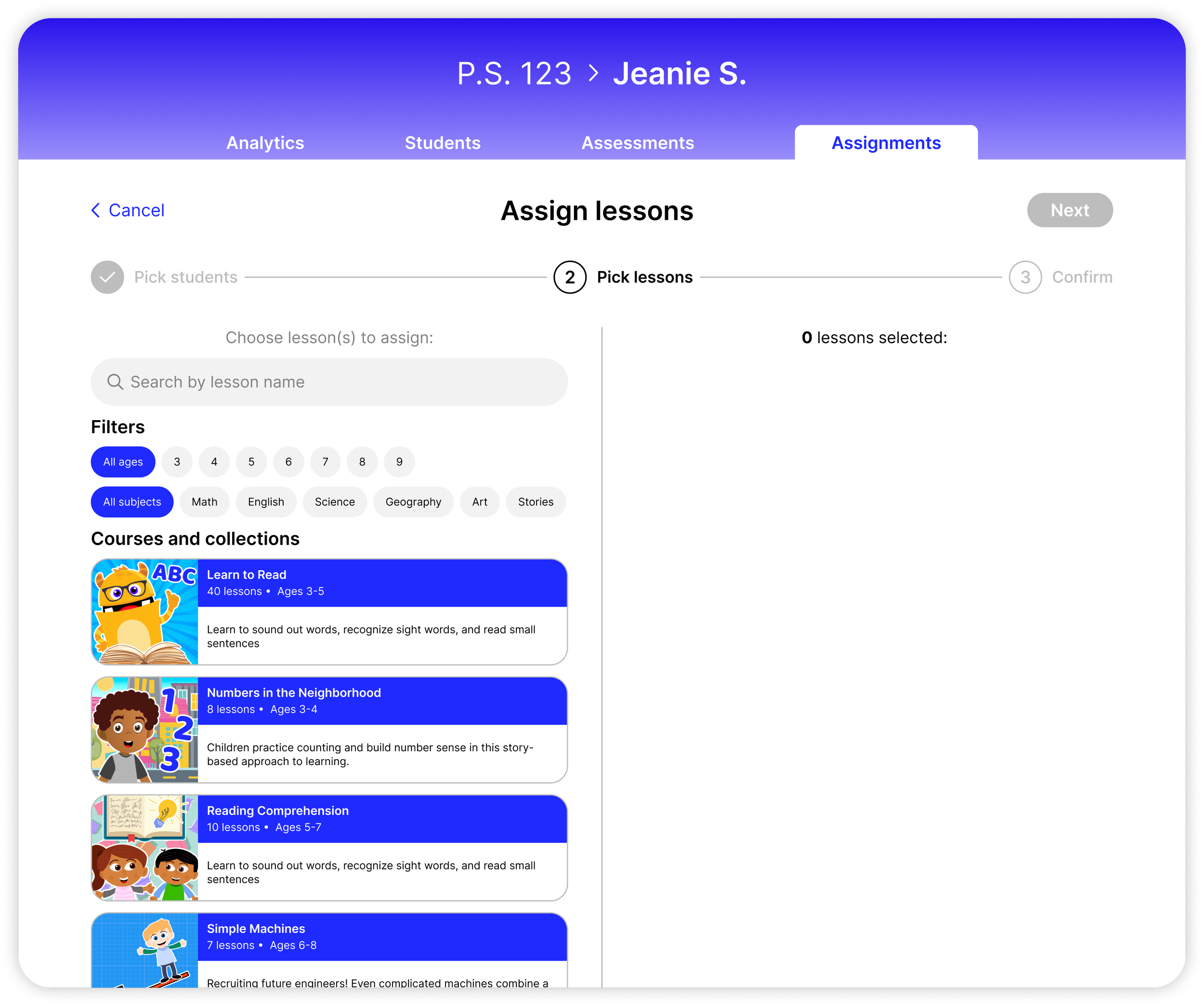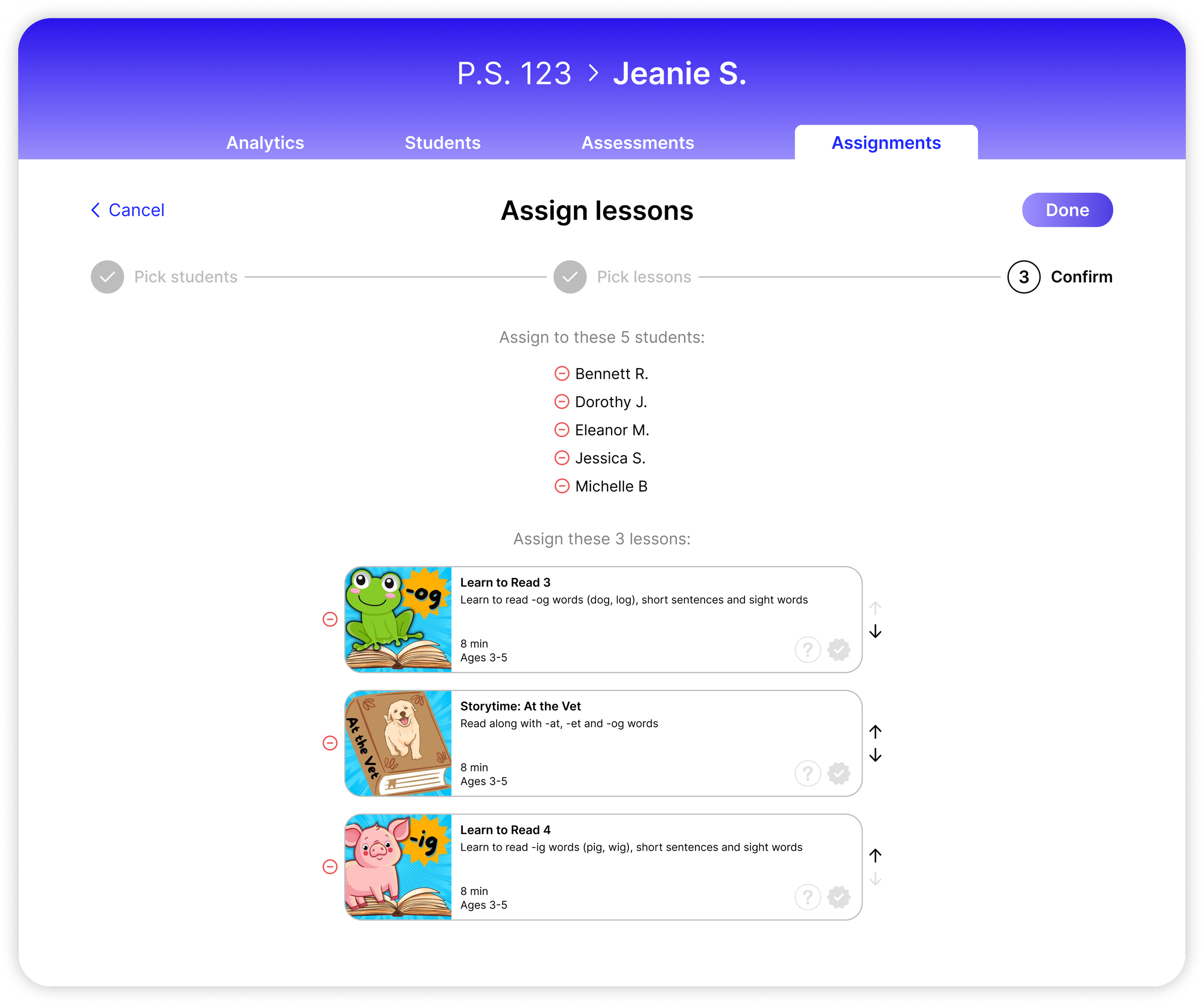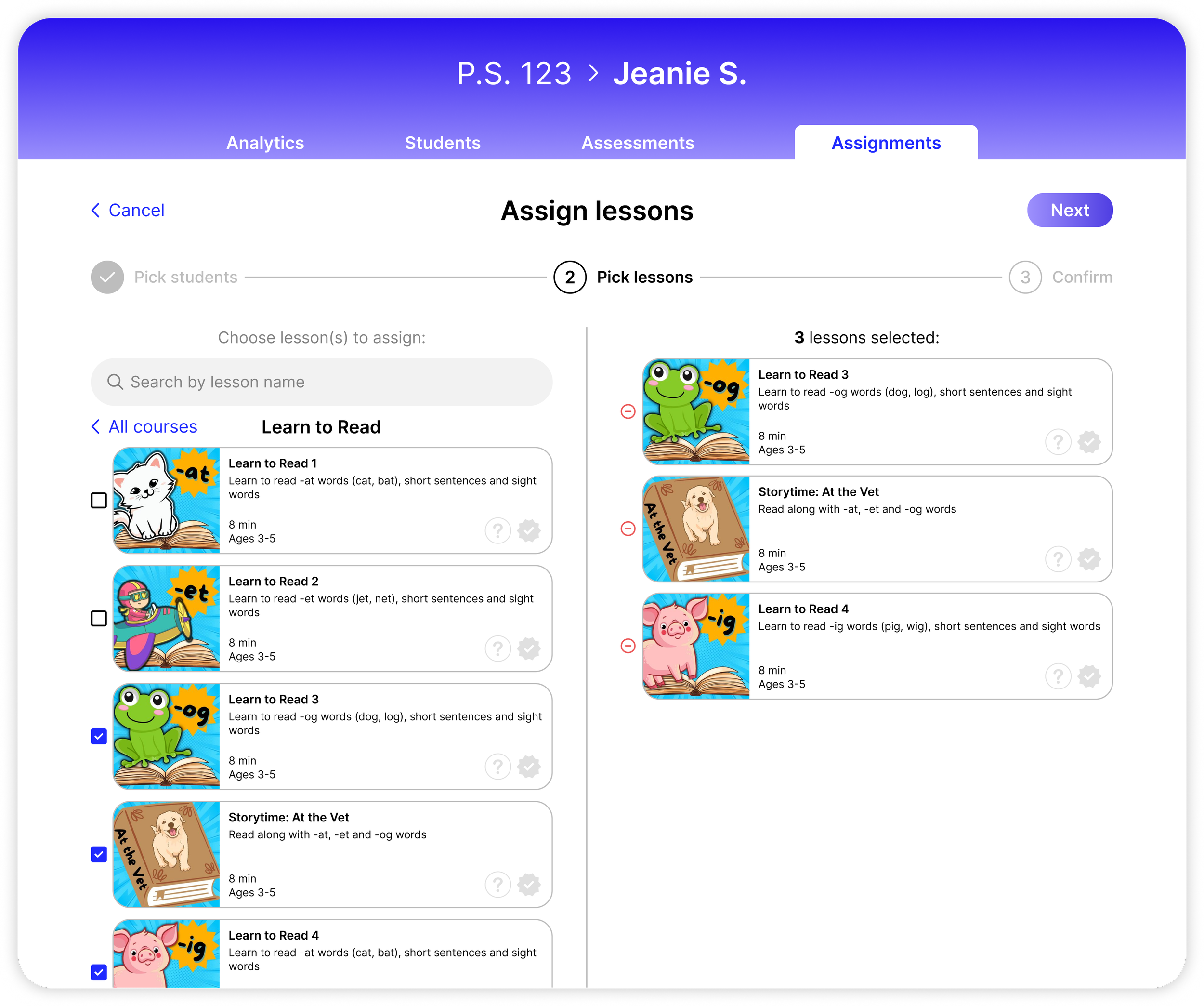 The dashboard doesn’t just summarize data — it also provides tools to make it as easy as possible for teachers to see how well their students are doing and set their next steps. One feature is the Lesson Assignment, which allows teachers to assign lessons to their entire class, or to specific students based on their needs. This functionality appears in multiple locations with different relevant entrypoints: on the start screen for a specific lesson (where a teacher might be looking at a lesson and decide to assign it to students), on a student’s page (where a teacher might be reviewing a specific student’s progress and decide to assign them lessons), and on the general Assignments page (where a teacher may want to assign multiple lessons to multiple students). When the app automatically suggests follow-up lessons based on a student’s performance, it’s easy for a teacher to assign those lessons immediately as well, so a teacher has recommended actions to take without having to dig through all of our content. An adapted version of this workflow also makes it simple for a teacher to update past assignments, by adding/removing students and lessons.